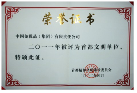 今年4月,2011年度首都精神文明創(chuàng)建工作先進(jìn)單位的評(píng)選活動(dòng)正式揭曉,中免集團(tuán)被首都精神文明建設(shè)委員會(huì)授予首都文明單位榮譽(yù)稱號(hào)。