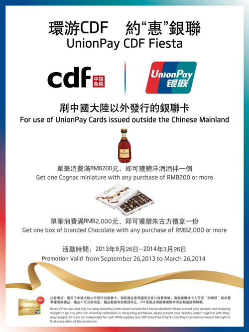 刷中國(guó)大陸以外發(fā)行的銀聯(lián)卡,單筆消費(fèi)滿200元,即可獲贈(zèng)品牌洋酒酒伴一個(gè);單筆消費(fèi)滿2000元,即可獲贈(zèng)品牌巧克力禮盒一份。