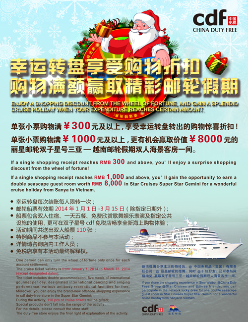 圣誕元旦臨近,旅游價(jià)格相對(duì)平穩(wěn)、上班族集中休假等因素使得今年雙節(jié)旅游市場(chǎng)再次迎來(lái)出游小高峰。其中不少公司白領(lǐng)將春節(jié)出境游計(jì)劃提前,選擇性價(jià)比更高的錯(cuò)峰出游。各大商家的年終促銷活動(dòng)讓節(jié)日提前升溫,2013年12月15日-2014年1月5日期間,中國(guó)免稅品(集團(tuán))有限責(zé)任公司(以下簡(jiǎn)稱中免集團(tuán))旗下十家免稅店聯(lián)合推出“幸運(yùn)轉(zhuǎn)出來(lái)&幸運(yùn)秀出來(lái)”年終主題促銷活動(dòng),貼心的購(gòu)物折扣以及價(jià)值約百萬(wàn)元的麗星郵輪船票大獎(jiǎng),為雙節(jié)出境游客送上別樣驚喜。