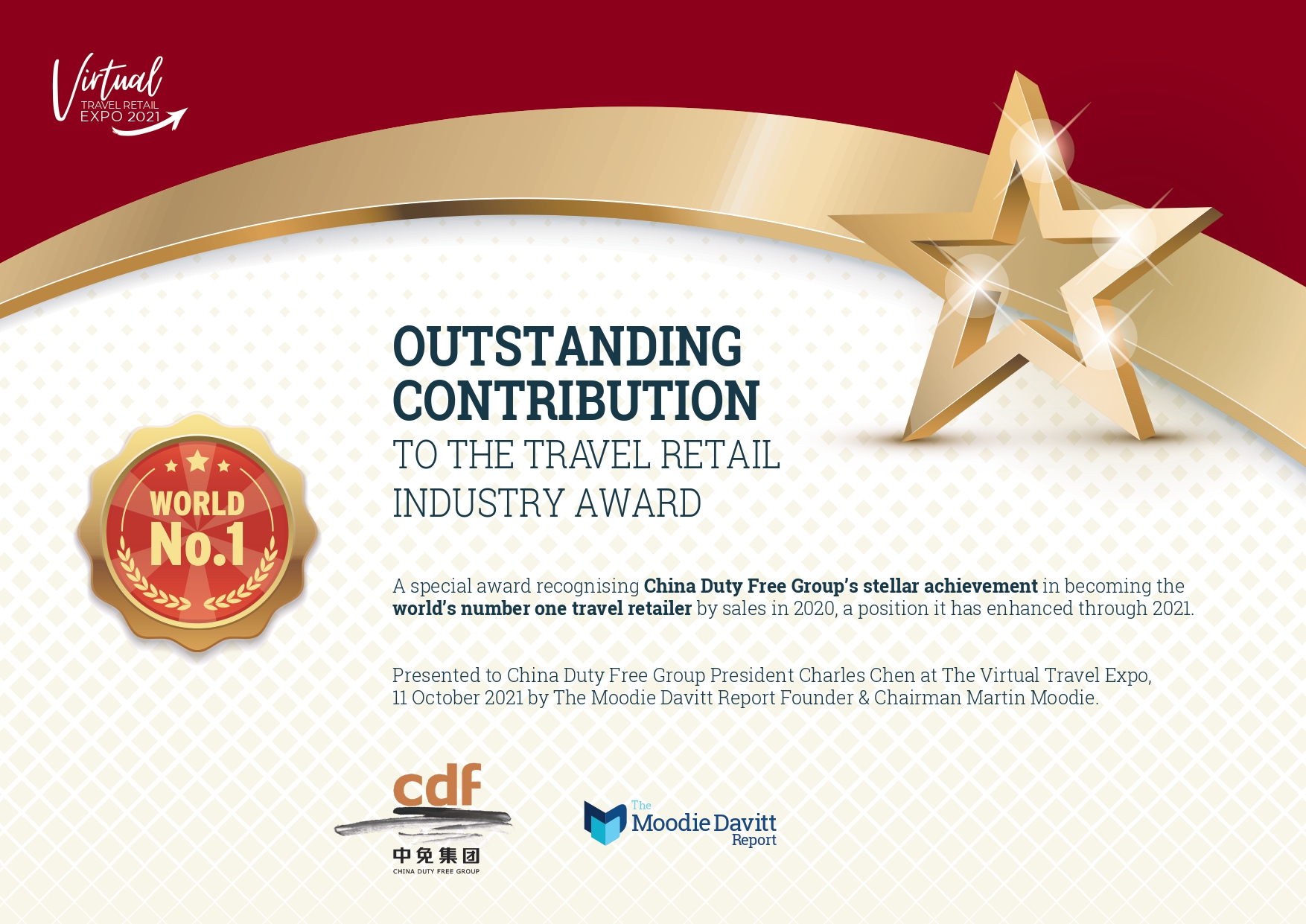 Martin Moodie表示:“我很榮幸能夠?yàn)橹忻饧瘓F(tuán)頒發(fā)這個(gè)杰出貢獻(xiàn)獎(jiǎng)——此獎(jiǎng)項(xiàng)旨在表彰中免集團(tuán)在2020年成為全球旅游零售業(yè)銷售額冠軍的卓越成就,熱烈祝賀!”