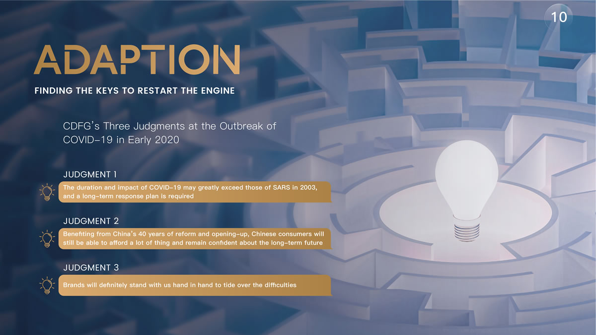 陳國強(qiáng)指出:"在三年前疫情剛剛爆發(fā)時(shí),我做出了3個(gè)判斷:一是這場疫情的持續(xù)時(shí)間可能會大大超過2003年的非典,我們必須做出長期的應(yīng)對規(guī)劃;二是雖然疫情會帶來各方面的不利影響,但在中國40年改革開放的紅利下,消費(fèi)者仍保持著強(qiáng)勁的消費(fèi)能力并對未來長期充滿信心;三是品牌方一定會和我們站在一起,共謀方略,共渡難關(guān)。"