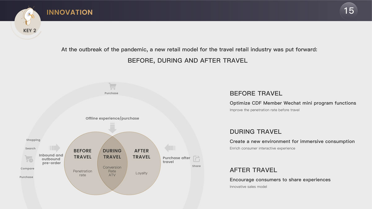 在創(chuàng)新發(fā)展方面,中免集團(tuán)主要開展了三大方面的探索,包括完善了基于行前、行中、行后的旅游新零售模式,針對中國最有消費(fèi)能力客群推出超級VIP服務(wù),以及將充滿科技感和體驗(yàn)感的元素融入線上線下消費(fèi)場景。